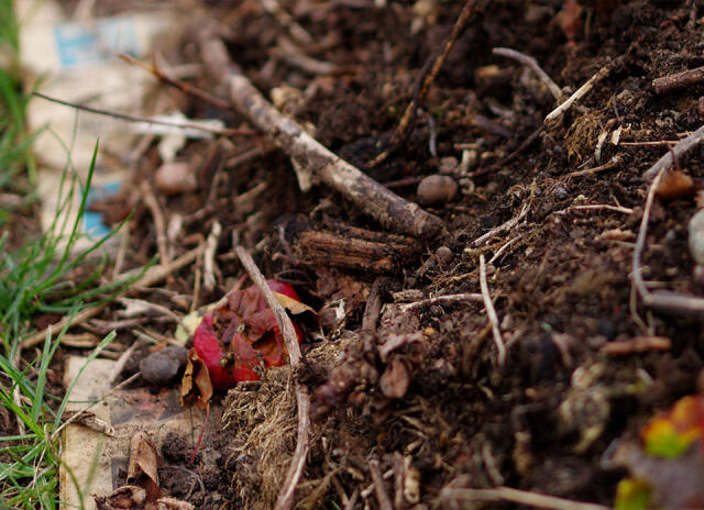 4. Når foråret kommer, graves komposten om og efterkomposteres i beholderen eller i en bunke på jorden.