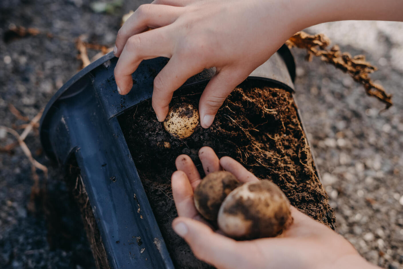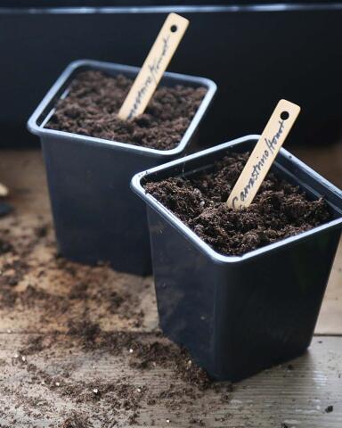 Jeg vil plante to kartofler i den ene potte og tre i den anden. Grunden er, at jeg bruger to forskellige slags kartofler. En frisk kartoffelsort, der vil være klar til at høste i løbet af sommeren, og en læggekartoffel, der er klar til at blive høstet til efteråret. Den friske kartoffelsort er lidt mindre end efterårssorten, hvor der er plads til 3 kartofler i den ene. Efterårssorten er større, og derfor er to kartofler nok. Prøv dig frem, men jeg anbefaler generelt mellem 2 - 4 kartofler i en potte afhængig af sorten.