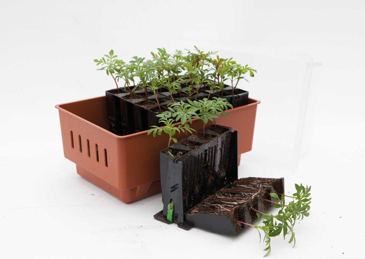 Efterhånden som rødderne gradvist kommer ud af ventilationshullerne i pottecellerne, tørrer enderne på rødderne ud, og der dannes nye rødder højere oppe. Pottecellerne kan åbnes på midten ligesom en bog, hvilket gør det endnu nemmere at håndtere planterne.